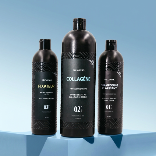 Pack Lissage Collagène (100 ml, 500 ml ou 1 L) : parfait pour cheveux fins, méchés ou endommagés, il apporte hydratation, brillance et protection.